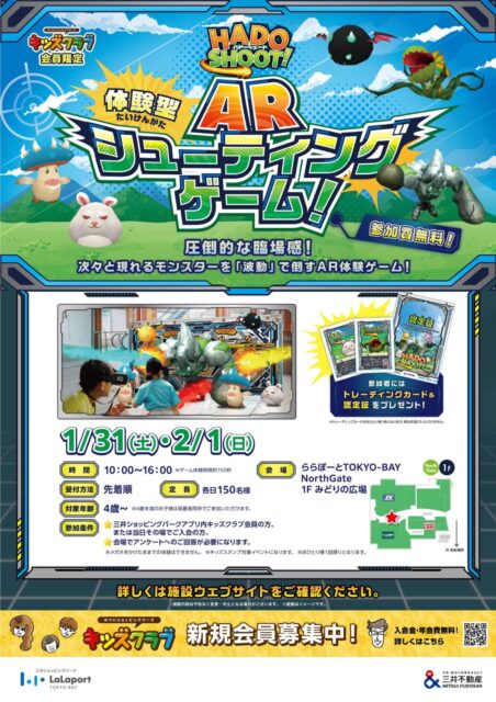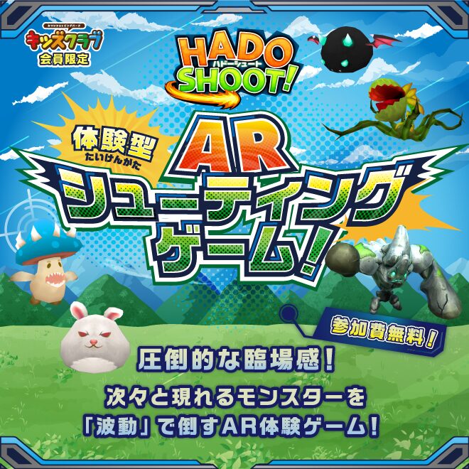 ららぽーとTOKYO-BAYにて、キッズクラブ会員限定の体験型ARシューティングゲーム「HADO SHOOT!」が開催されます。モーションセンサーを装着し、拡張現実の世界に出現するモンスターを“波動”で倒す、圧倒的な臨場感が魅力のAR体験イベント。まるで自分がゲームの主人公になったかのような感覚を楽しめます。参加者にはトレーディングカードと認定証のプレゼントもあり、思い出に残る体験ができる内容です。